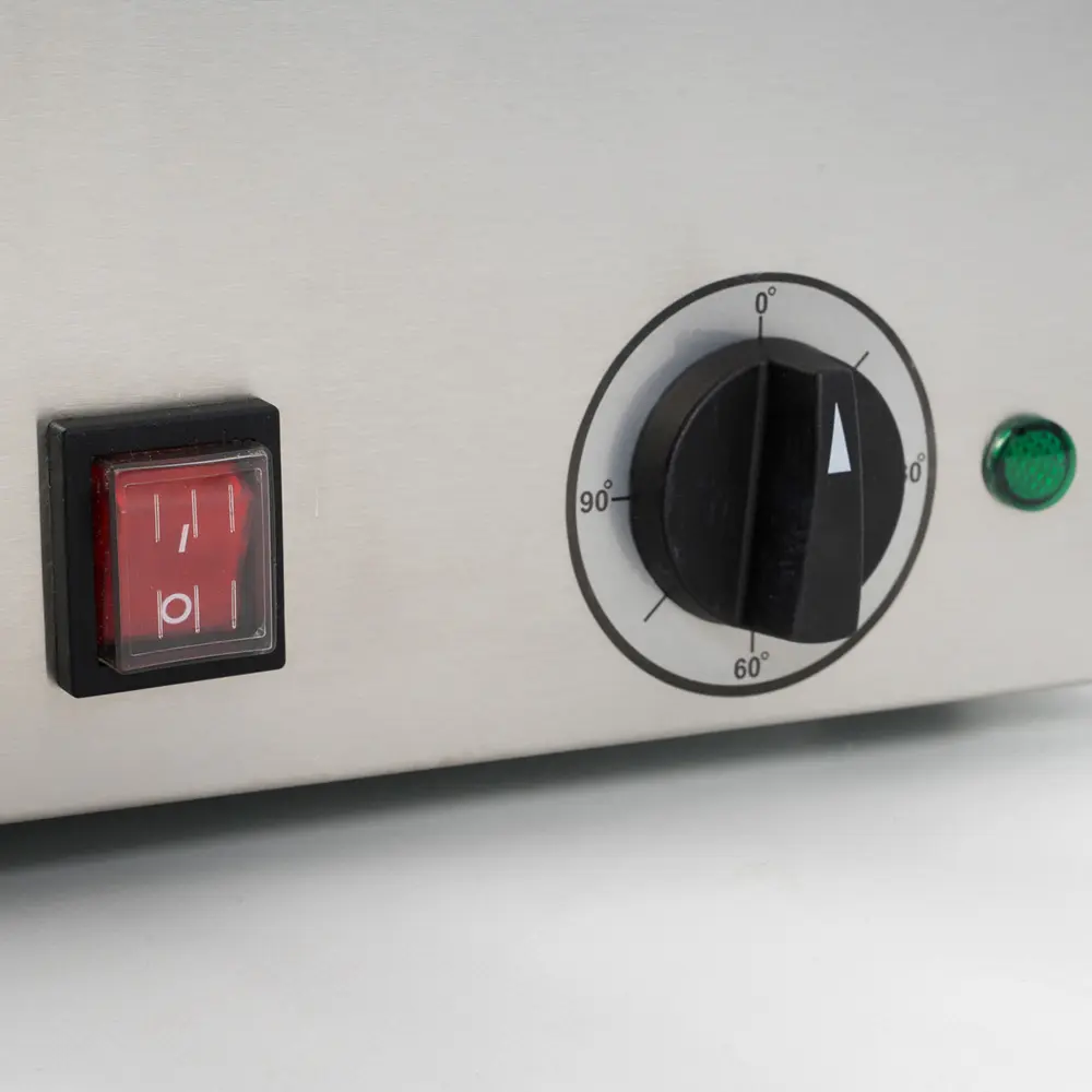 Its operation is simple: a power button and temperature control knob allow you to adjust the heat according to the product. With a nominal power of 1.2 kW and a 230 V / 50 Hz power supply, it delivers stable performance at events, fairs, and during continuous service. The unit is compact and easy to clean, making it ideal for mobile catering that requires speed and consistency.