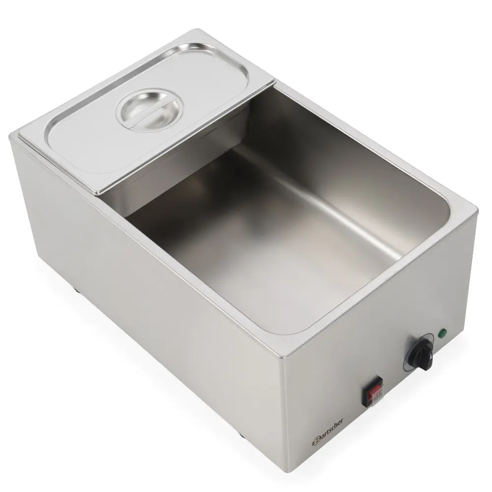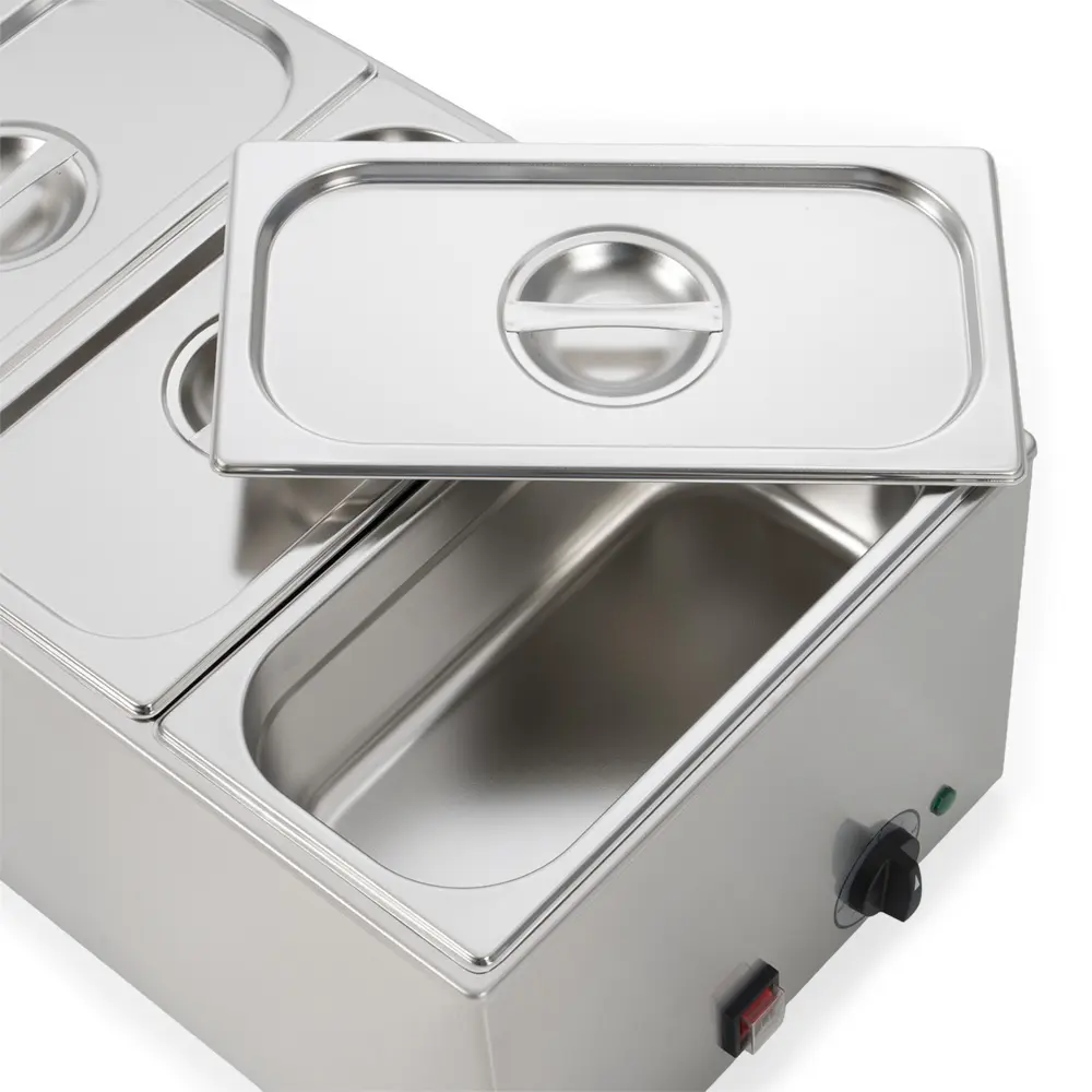 Designed to be integrated into food carts, the electric bain-marie allows you to heat and keep sauces, sausages, toppings, and ready-to-serve dishes at the ideal temperature, with a temperature control range of 65° C to 95° C. It includes three 1/3 GN stainless steel pans, each 150 mm deep and equipped with a lid, ensuring hygienic operation and an organized mise en place.
