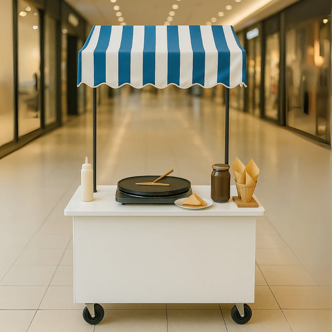 El Carrito de Crepes Essential está diseñado para quienes buscan un carrito de crepes práctico, higiénico y rentable. El toldo estándar aporta sombra y visibilidad, mientras que el mostrador —en acabado blanco o inoxidable— ofrece una superficie lisa y de limpieza rápida para preparar, rellenar y servir.
