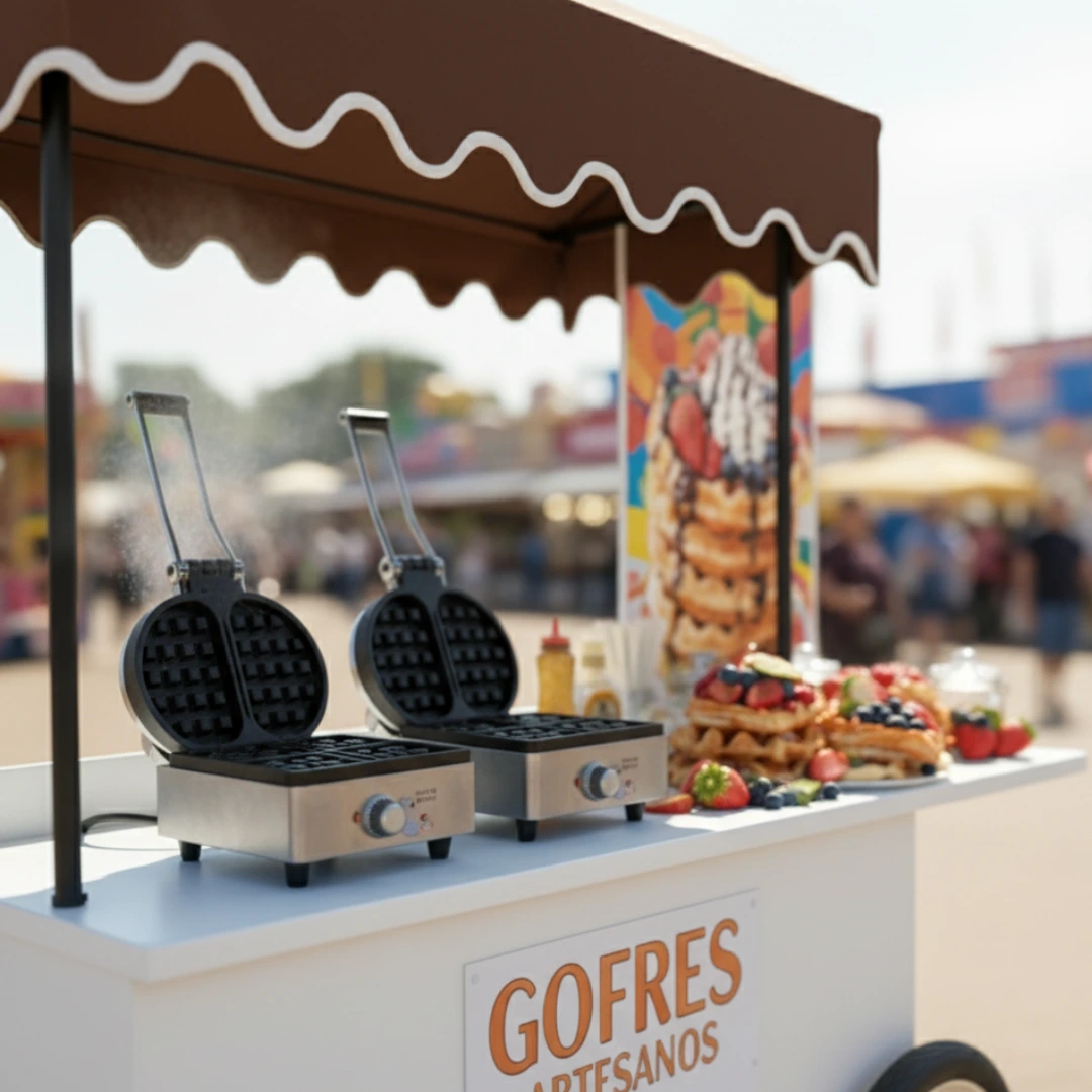 El Carrito de Gofres Deluxe está diseñado para maximizar ventas con un flujo de trabajo ágil. Su toldo en color especial atrae miradas y aporta sombra; el mostrador (acabado blanco o inoxidable) ofrece una superficie lisa, resistente y de limpieza rápida para la preparación, toppings y emplatado.