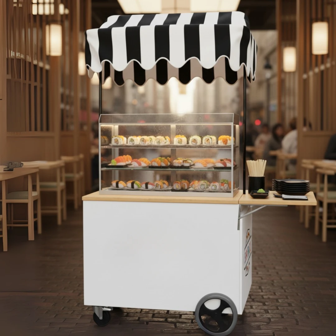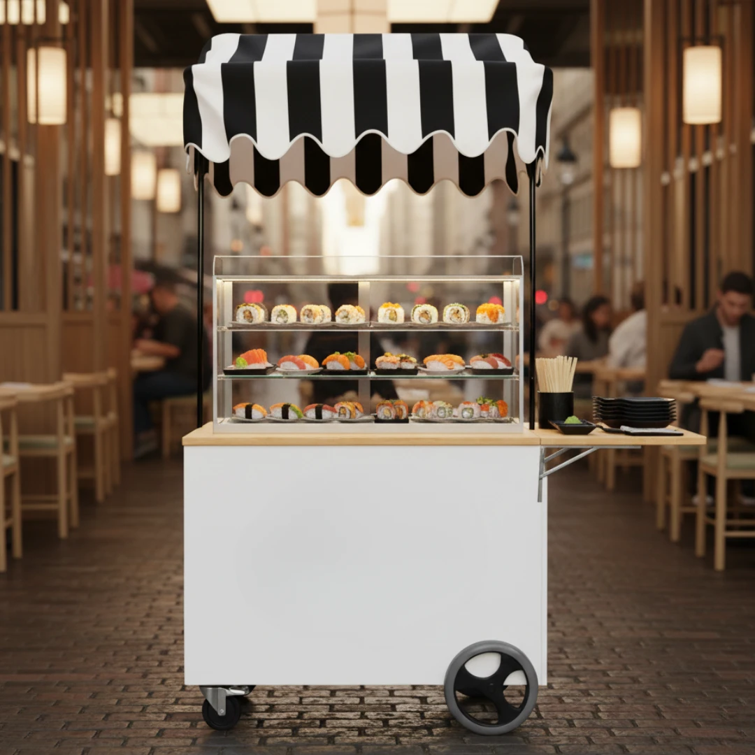 El Carrito de Sushi Premium está diseñado para ofrecer un punto de venta de sushi ágil y atractivo. Su toldo de color estándar mejora la visibilidad y aporta sombra a la zona de trabajo. El mostrador (blanco o inoxidable) proporciona una superficie higiénica y de limpieza rápida para la mise en place y el emplatado.