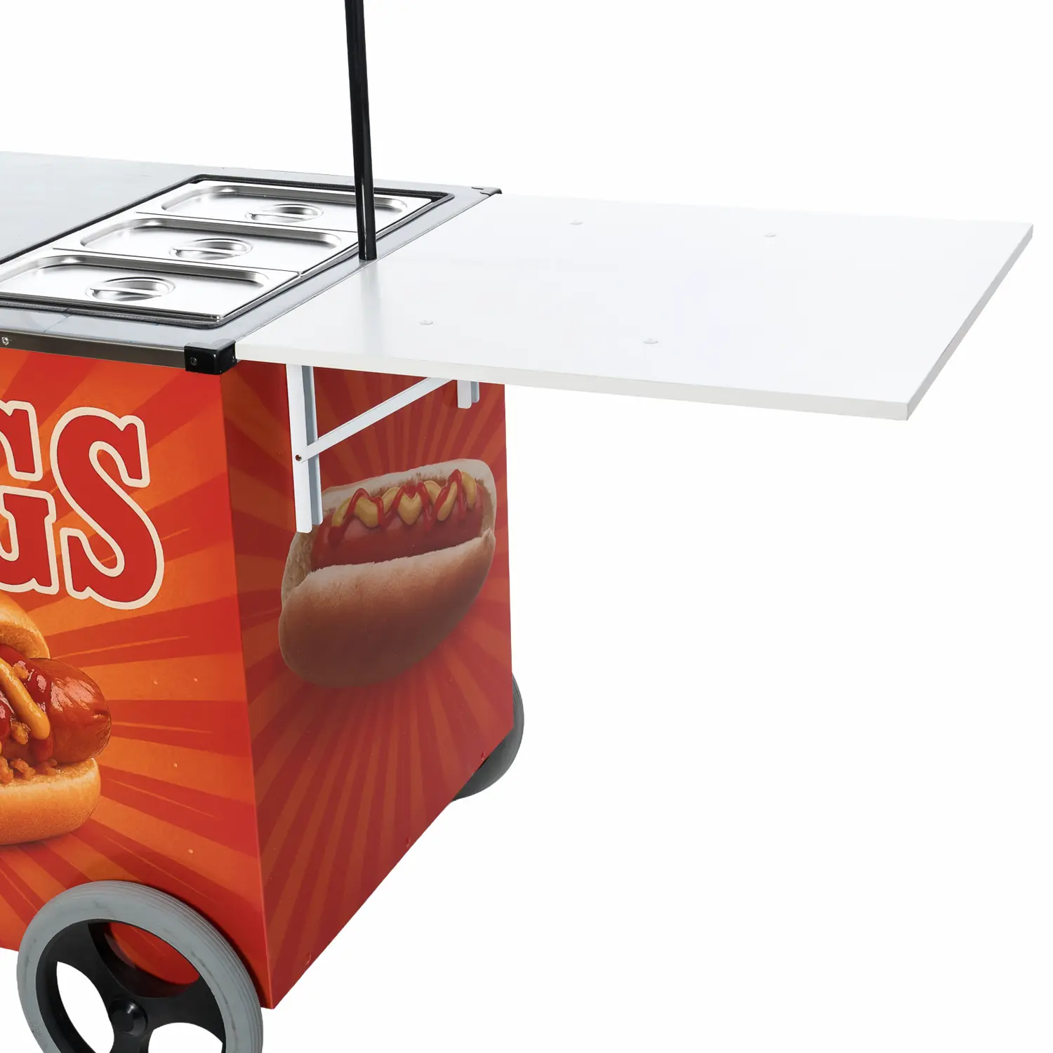 El Carrito de Hot Dogs Premium está diseñado para operar como un puesto de hot dogs eficiente y atractivo. El toldo en color estándar mejora la visibilidad y aporta sombra a la zona de trabajo; el mostrador (blanco o inoxidable) ofrece una superficie lisa, resistente y de limpieza rápida para preparación y servicio.