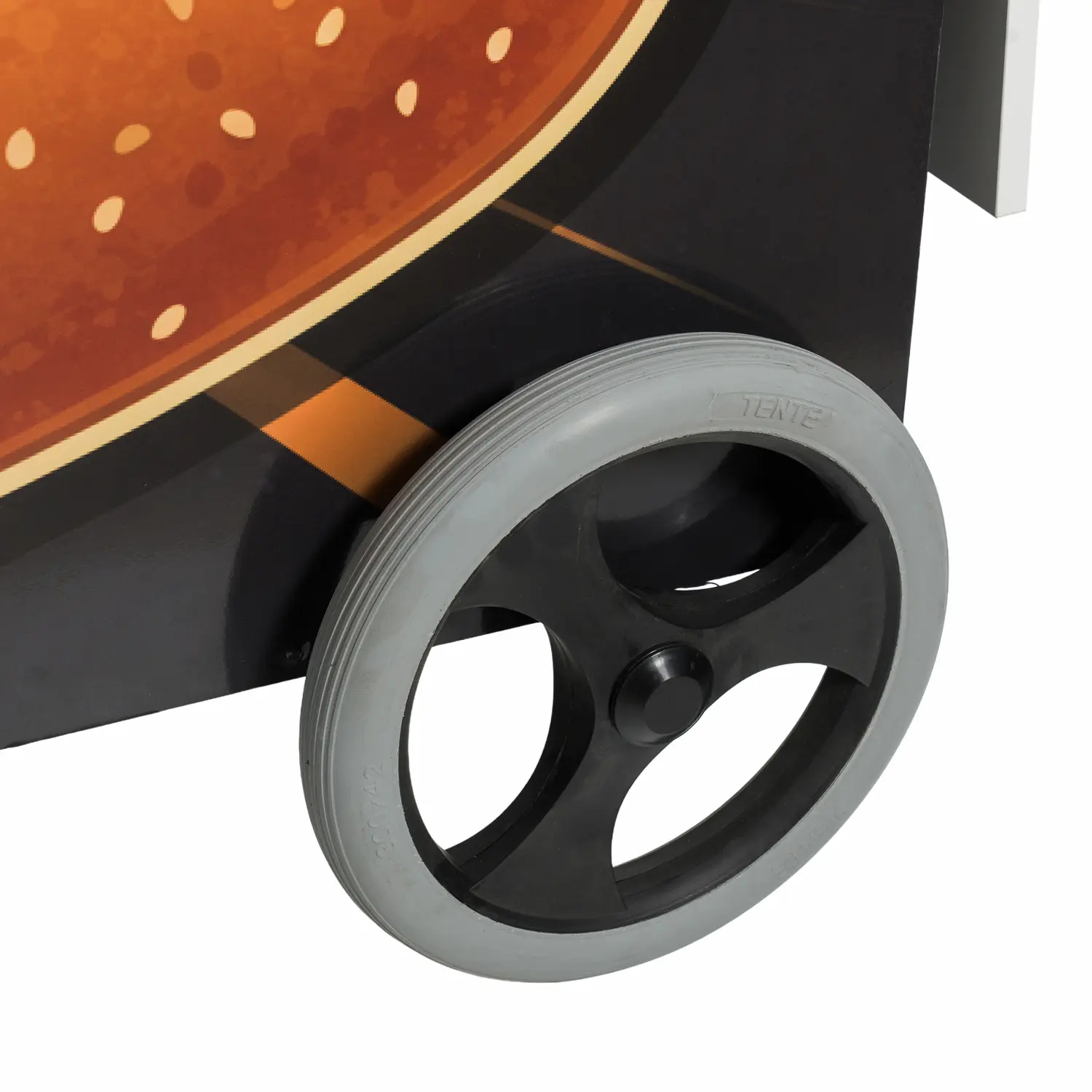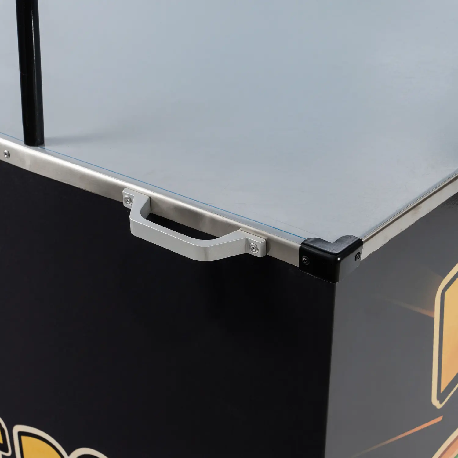 Para una operativa fluida, incorpora 2 ruedas giratorias con freno y 2 ruedas macizas antipinchazos de 12″, lo que facilita el desplazamiento entre ubicaciones y garantiza estabilidad durante la venta. La rotulación de logo frontal refuerza tu identidad de marca, mientras que la mesa abatible de 65×60 cm añade espacio extra de trabajo en picos de demanda y se repliega para transporte y almacenamiento.