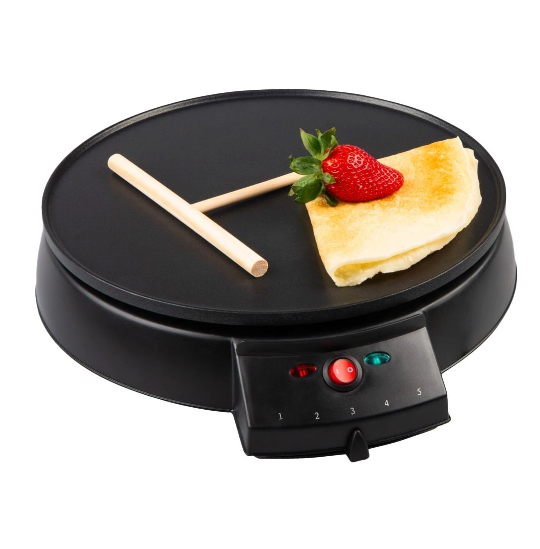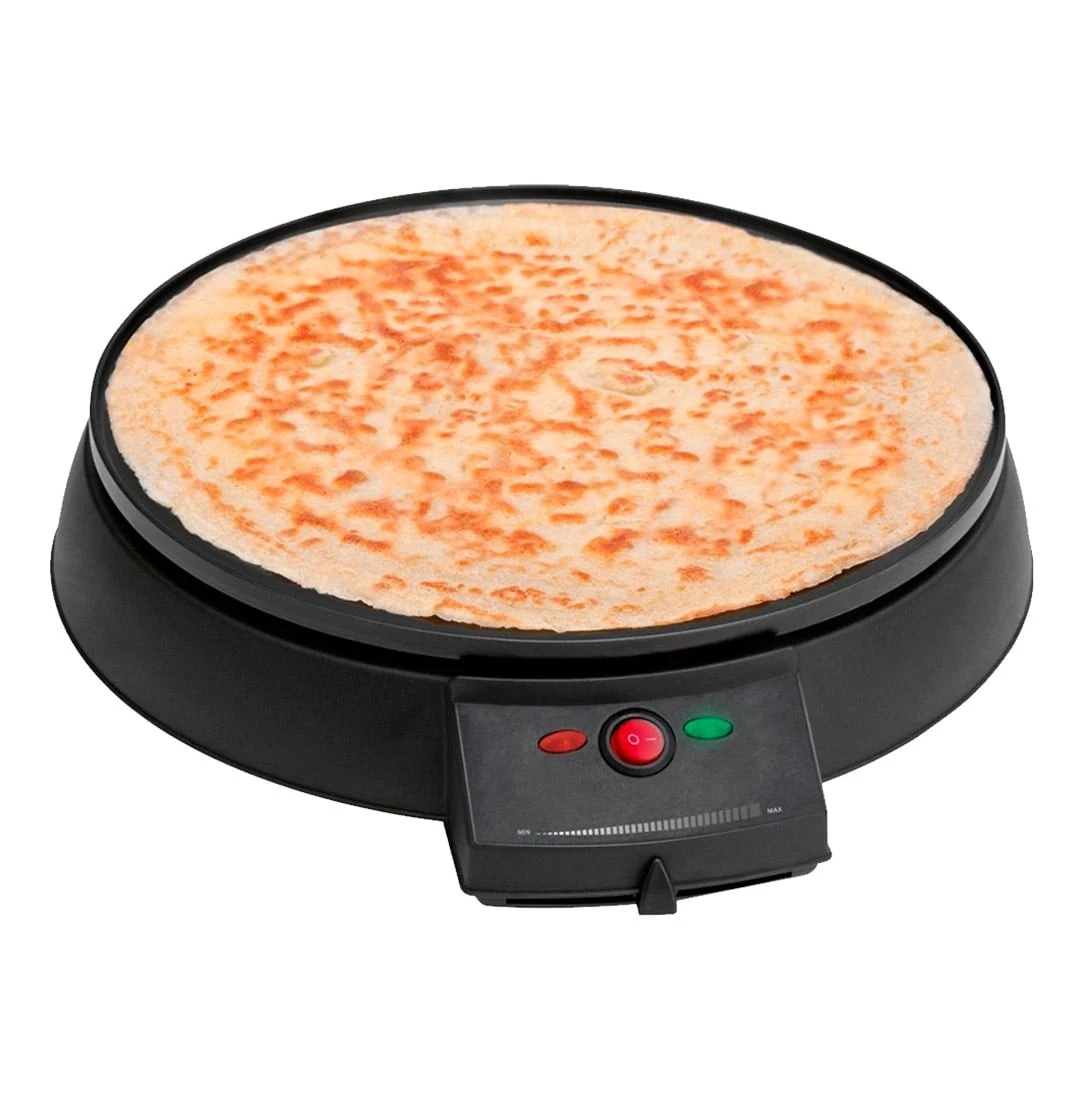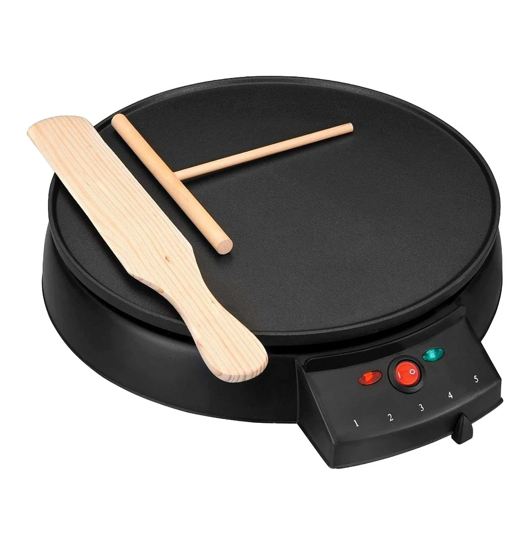 Incluye rastrillo/esparcidor y pala para extender la masa con precisión y levantar el crepe sin esfuerzo, lo que agiliza el flujo de trabajo en ferias, mercados y catering. Su diseño funcional en negro aporta estética profesional y la hace adecuada también para pancakes o tortillas finas.
