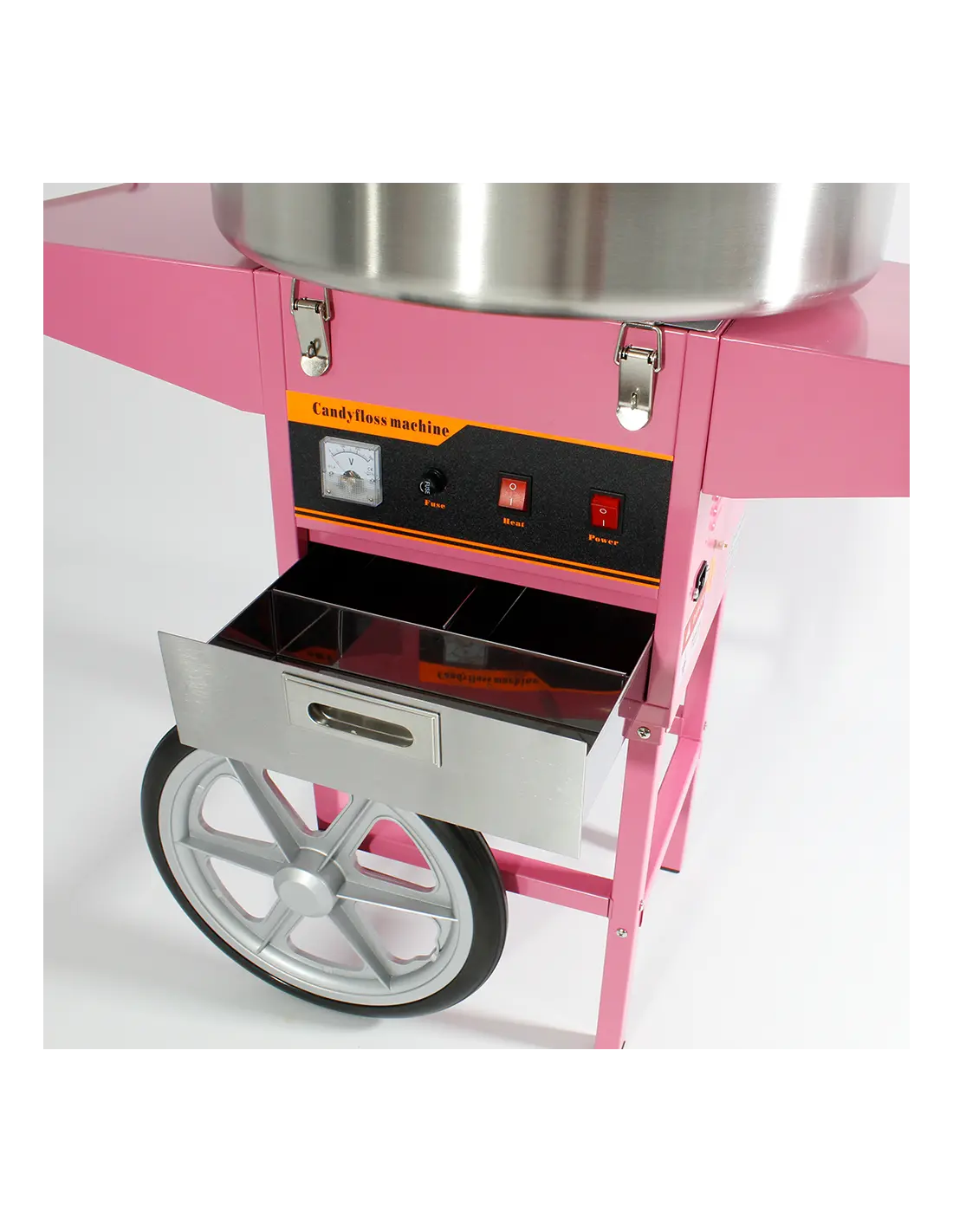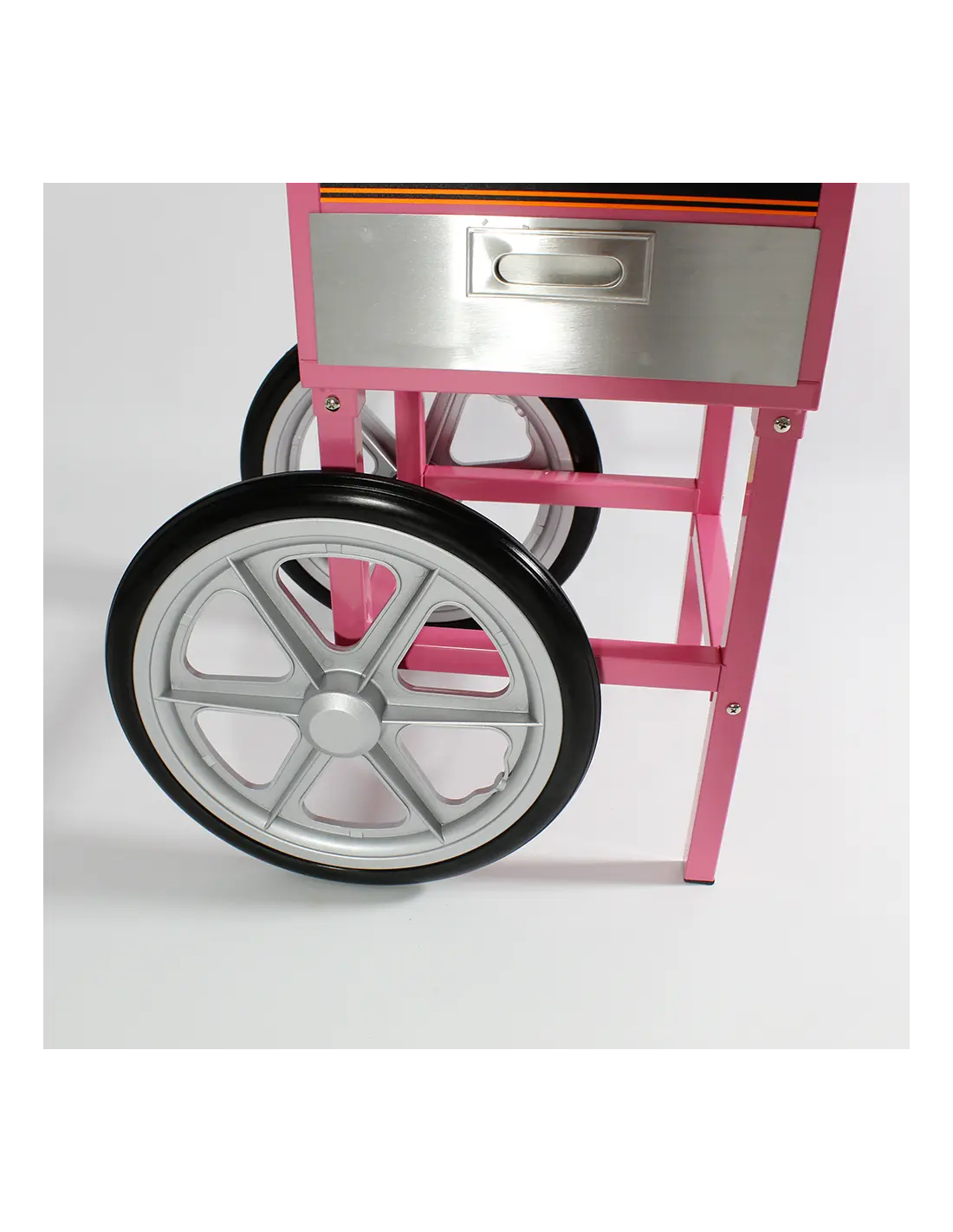 The integrated cart makes mobility and presentation easier: the retro pink finish catches the eye and turns the sales point into an attraction. With a capacity of 2 cotton candies per minute (1 serving of 12–18 g every 30 seconds), you’ll be able to handle peak demand without delays and with an impeccable presentation.