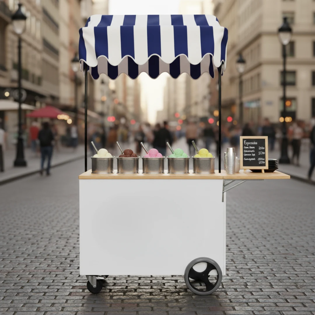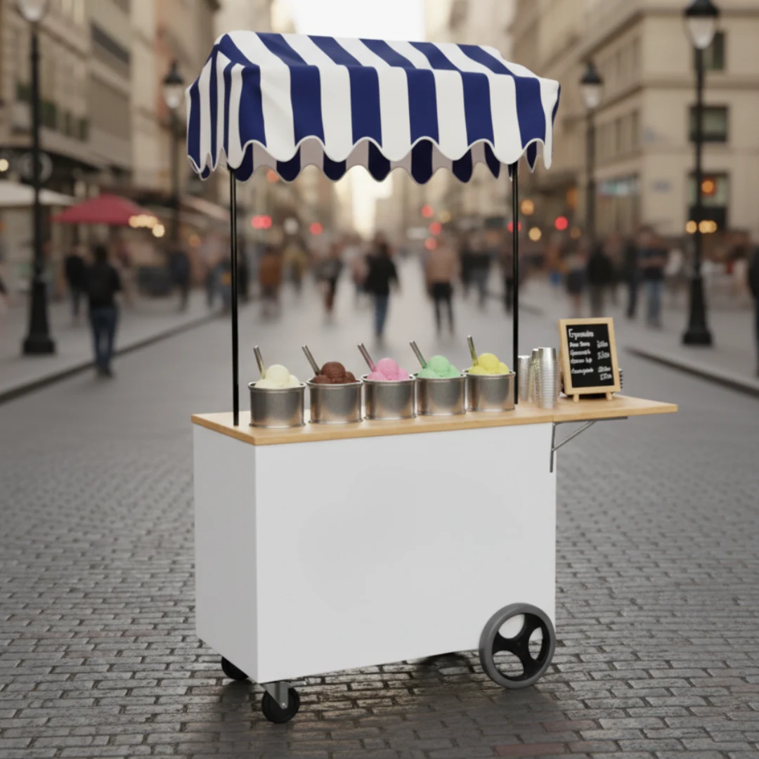 Transforma qualquer espaço num ponto de venda de gelados atraente e rentável. O carrinho de gelados Premium combina visibilidade, capacidade de refrigeração e mobilidade segura para servir gelados e picolés com uma apresentação impecável em eventos, feiras comerciais e catering.